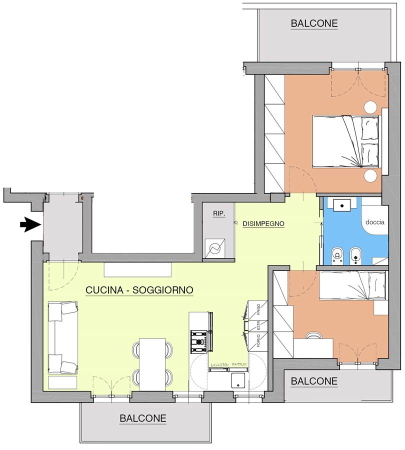 L'appartamento è composto da una zona living con angolo cottura ed accesso ad un balcone, una camera singola con balcone privato, una spaziosa camera matrimoniale con accesso a un altro balcone, un pratico ripostiglio, un bagno moderno con doccia e una cantina.