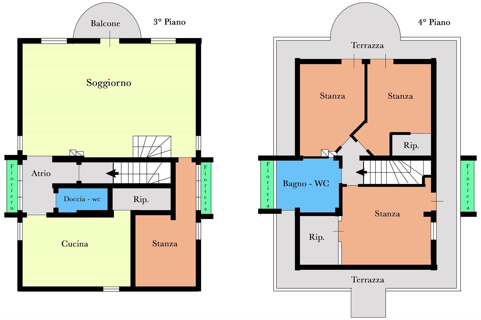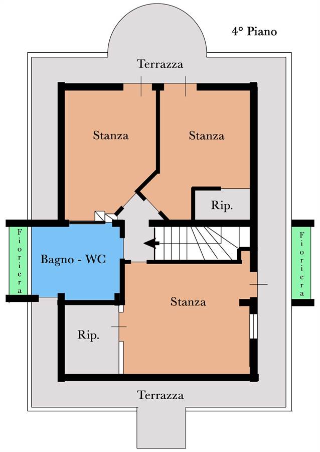 L’appartamento è disposto su due livelli (terzo e quarto ed ultimo piano) ed è libero su tutti e quattro i lati, con ottima luminosità e ambienti ariosi durante tutta la giornata.