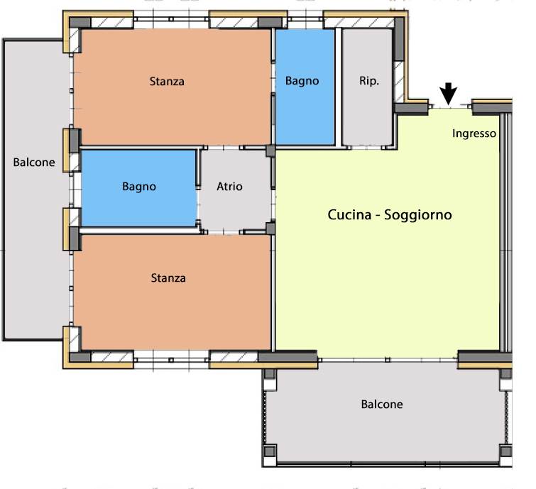 L’immobile, identificato come Appartamento 1, è un trilocale al primo piano, caratterizzato da grande luminosità e ottima esposizione.