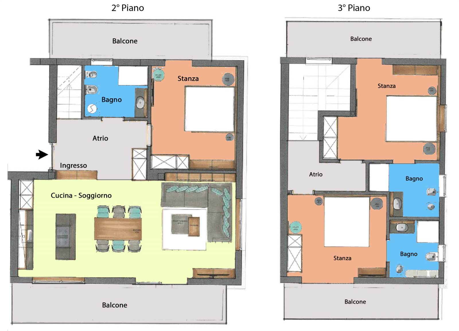 L’appartamento, sviluppato su due livelli, è luminoso e con ottima esposizione, ed è composto da ampio soggiorno con cucina abitabile, tre camere da letto e due bagni. L’unità dispone di balcone perimetrale che valorizza gli ambienti e offre una vista sulle montagne circostanti.